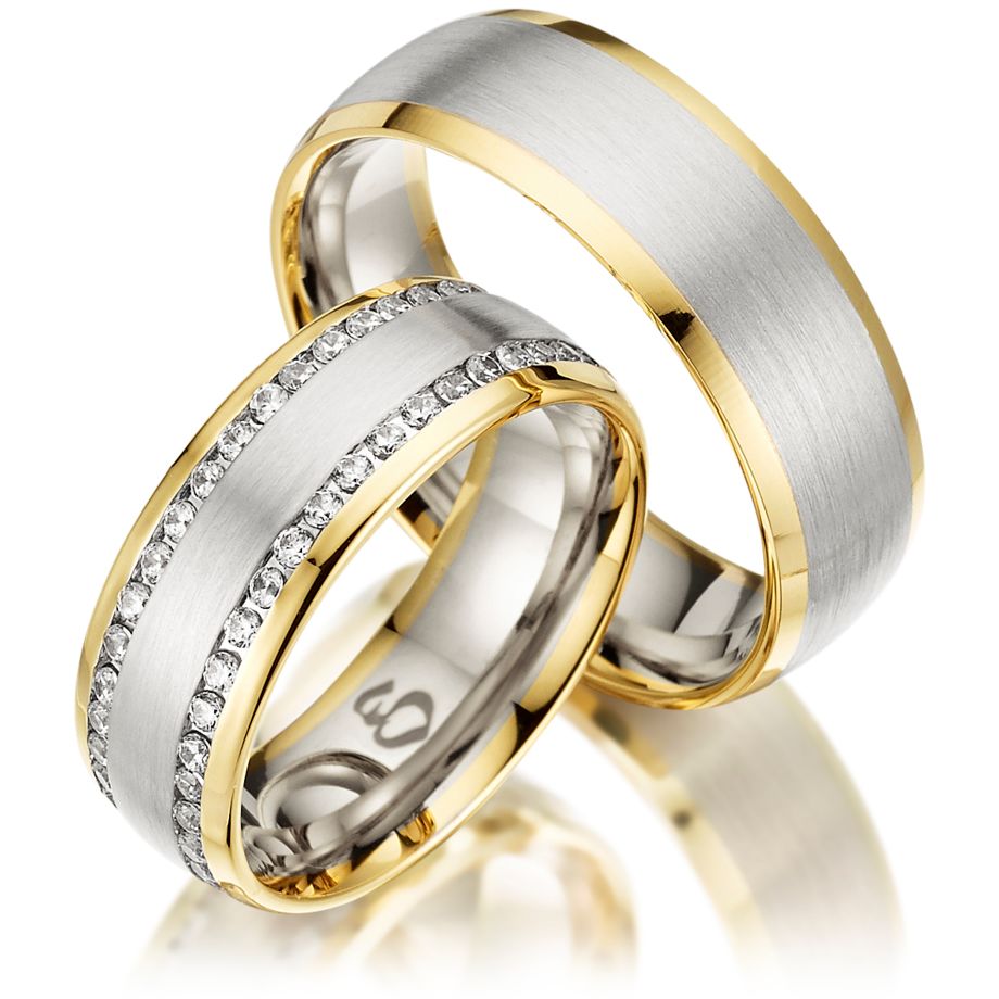 Diese besonderen Eheringe aus der Fantasy 2 Kollektion sind 7mm breit mit einer Stärke von 2mm. Die Ringe bestechen durch ihr außergewöhnliches 3farbiges Design, wobei die Mitte Weißgold längsmatt und die beiden Seiten gelbgold und poliert sind. Der Damenring wird durch einen Kanal beidseitig rundherum mit Diamanten mit 0,01ct. geziert. Die Anzahl variiert je nach Ringgröße (Beispiel: Größe 58 hat 48Diamanten je Seite, insgesamt 96Stück). Es gibt sie in allen Größen von 45 -75 in 0,5 Schritten. Außerdem kann die Goldlegierung 333, 375, 585 und 750 ausgewählt werden. Wir können Ihnen die Ringe ebenfalls in Weiß-, Rot-, Rosé-,Graugold und Platin anbieten, bitte kontaktieren Sie uns hierfür und wir beraten Sie gerne.