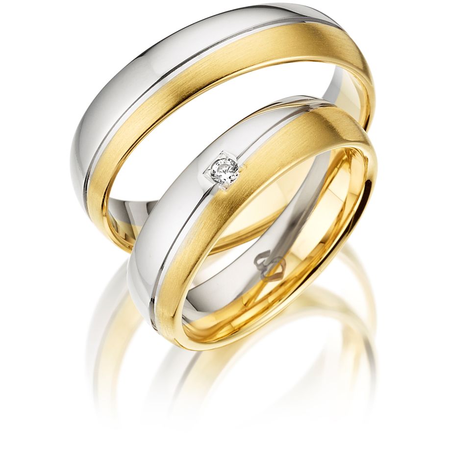 Diese schönen Eheringe aus der Fantasy 2 Kollektion sind 5,5mm breit mit einer Stärke von 1,7mm. Sie haben ein besonders rundliches Profil, sind zum Teil Weißgold poliert und Gelbgold längsmattiert. In der schrägen Mitte werden sie durch eine Trennfuge geteilt. Der Damenring wird mittig durch einen Verschnitt mit 1 Diamanten mit 0,03ct. geziert. Es gibt sie in allen Größen von 45 -75 in 0,5 Schritten. Außerdem kann die Goldlegierung 333, 375, 585 und 750 ausgewählt werden. Wir können Ihnen die Ringe ebenfalls in Weiß-, Rot-, Rosé-,Graugold und Platin anbieten, bitte kontaktieren Sie uns hierfür und wir beraten Sie gerne.