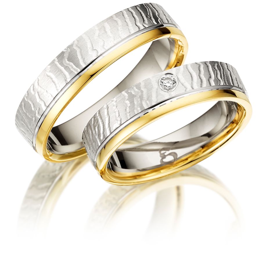 Diese besonderen Eheringe aus der Fantasy 2 Kollektion bestechen außergewöhnliches Design, sind 5mm breit mit einer Stärke von 1,6mm. Sie sind zweifarbig. Der größte Teil ist weißgold mattiert mit Streifenmuster, der kleinere Teil ist gelbgold poliert. Sie werden durch eine Trennfuge getrennt. Der Damenring wird außerdem von einem eingeriebenem Diamanten mit 0,03 ct. geziert. Es gibt sie in allen Größen von 45 -75 in 0,5 Schritten. Außerdem kann die Goldlegierung 333, 375, 585 und 750 ausgewählt werden. Wir können Ihnen die Ringe ebenfalls in Weiß-, Rot-, Rosé-,Graugold und Platin anbieten, bitte kontaktieren Sie uns hierfür und wir beraten Sie gerne.
