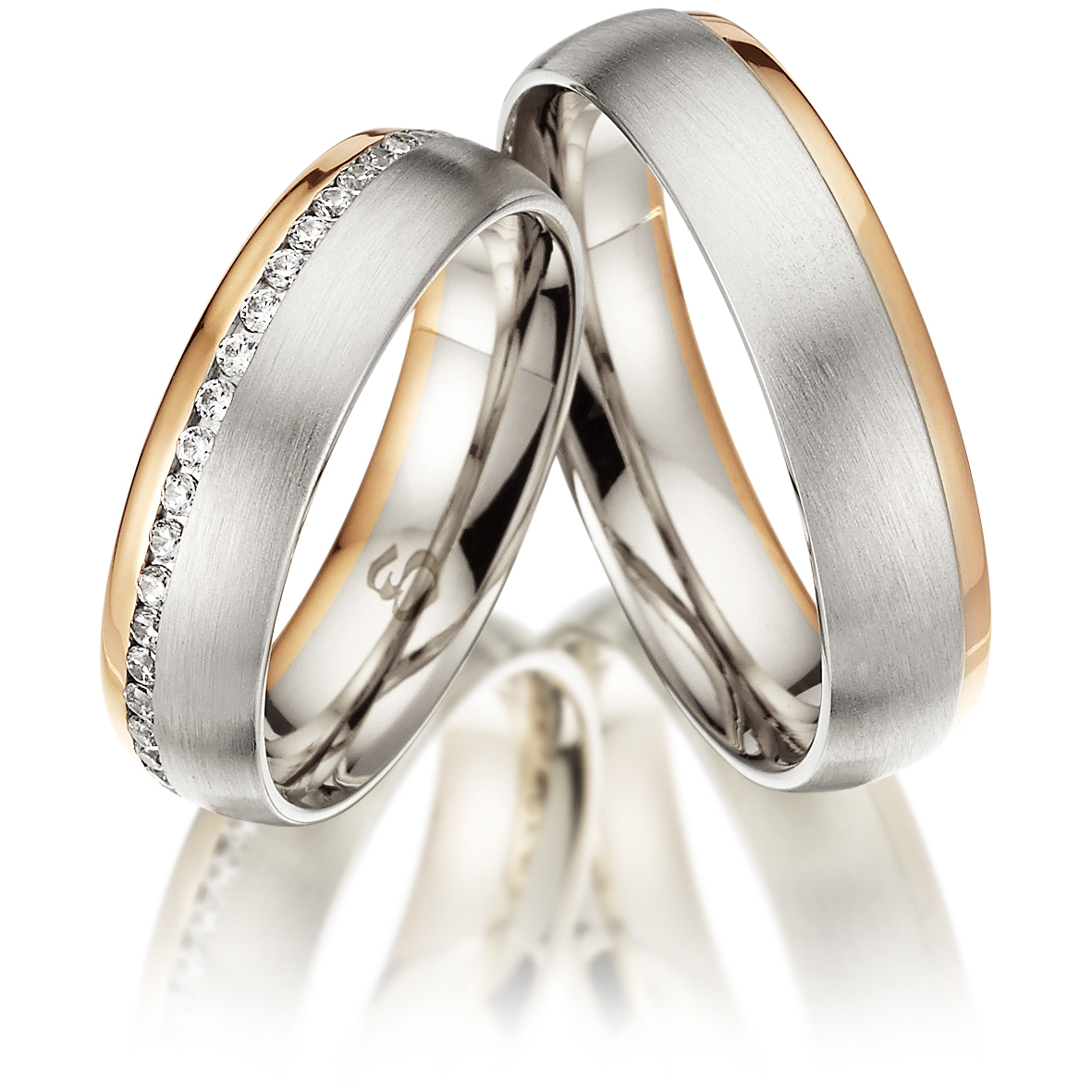 Diese schönen Eheringe aus der Fantasy 2 Kollektion sind 5,5mm breit mit einer Stärke von 2mm. Sie sind zweifarbig mit einer Trennfuge dazwischen. Eine Seite ist weißgold längsmatt und die andere roségold poliert. Der Damenring wird außerdem ringsherum durch 0,01ct. Diamanten in einem Kanal geziert. Die Anzahl variiert je nach Ringgröße. (In Größe 58 sind es 49 Stück). Es gibt sie in allen Größen von 45 -75 in 0,5 Schritten. Außerdem kann die Goldlegierung 333, 375, 585 und 750 ausgewählt werden. Wir können Ihnen die Ringe ebenfalls in Weiß-, Rot-, Rosé-,Graugold und Platin anbieten, bitte kontaktieren Sie uns hierfür und wir beraten Sie gerne.