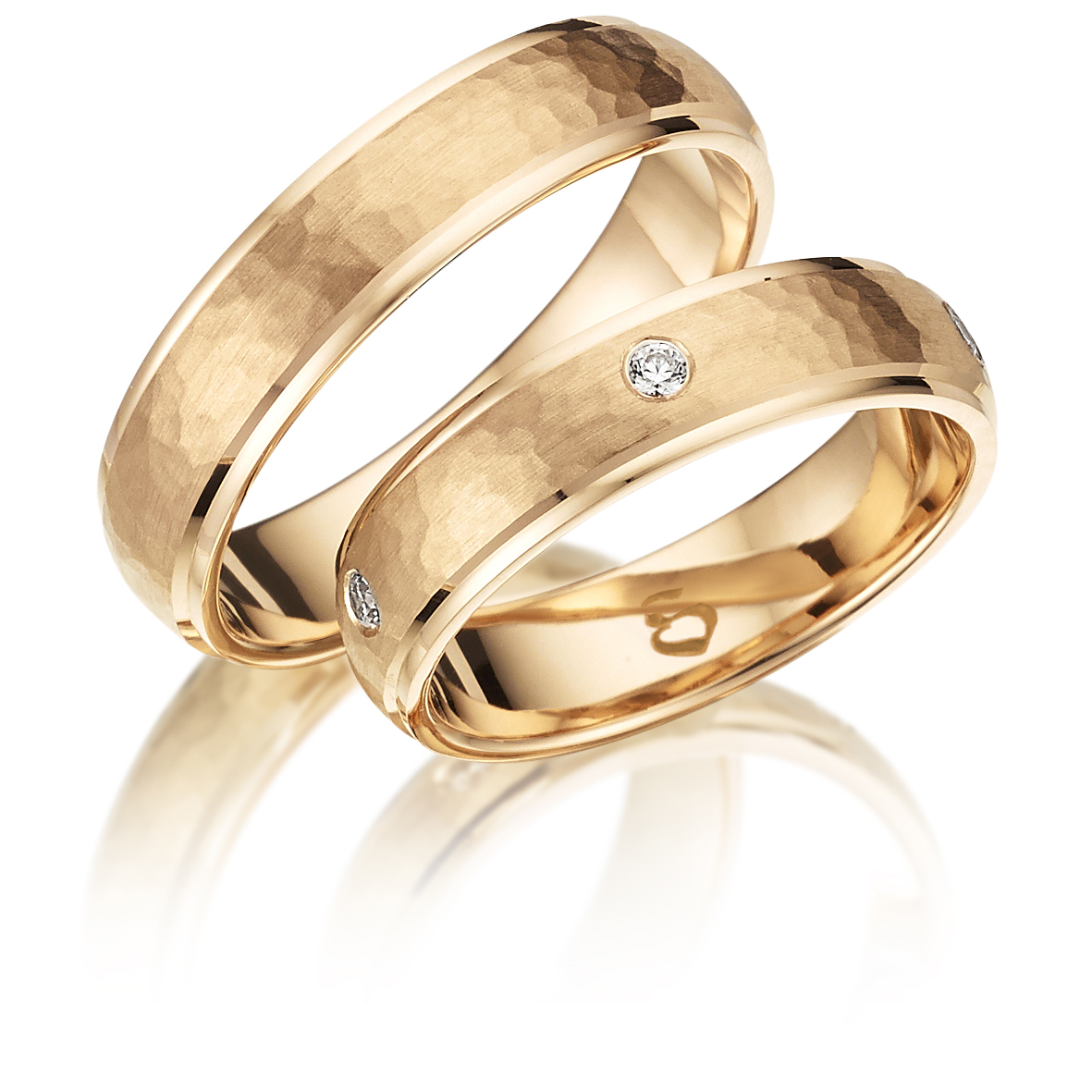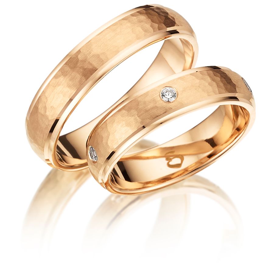 Diese schönen Eheringe aus der Fantasy 2 Kollektion sind 5mm breit mit einer Stärke von 1,6mm. Sie sind roségold mit mattem Hammerschlag, zusätzlich wird jede Seite durch eine 0,8mm breite Stufe geziert. Der Damenring wird außerdem durch 5 x 0,02ct. Diamanten über den ganzen Ring verteilt geschmückt. Es gibt sie in allen Größen von 45 -75 in 0,5 Schritten. Außerdem kann die Goldlegierung 333, 375, 585 und 750 ausgewählt werden. Wir können Ihnen die Ringe ebenfalls in Weiß-, Rot-, Rosé-,Graugold und Platin anbieten, bitte kontaktieren Sie uns hierfür und wir beraten Sie gerne.
