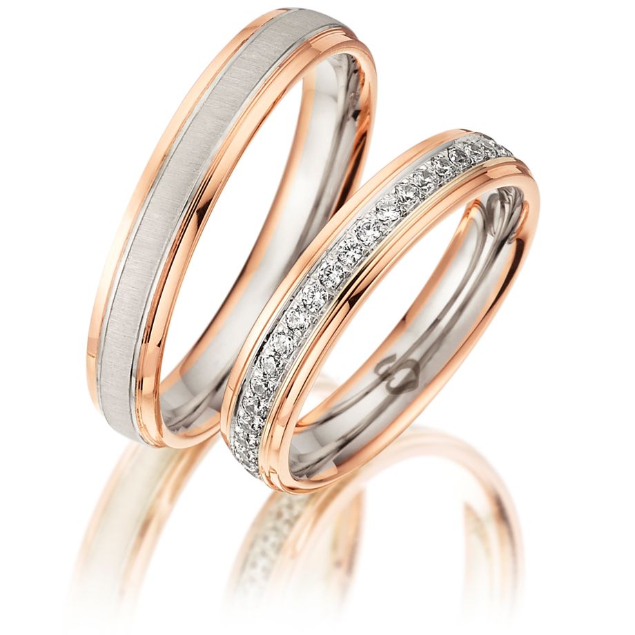 Diese schönen Eheringe aus der Fantasy 2 Kollektion sind 4mm breit mit einer Stärke von 1,8mm. Sie sind in drei Teile geteilt rot-/weiß-/rotgold. Der weißgoldene Teil in der Mitte ist quermattiert, auf seinen beiden Seiten befindet sich eine 0,8mm breite polierte Stufe. Der Damenring wird zudem mittig durch einen Verschnitt mit 0,01ct. Diamanten rundherum wunderschön geschmückt. Die Gesamtanzahl der Diamanten ist abhängig von der Ringgröße (In Größe 58 sind es 46 Stück). Es gibt sie in allen Größen von 45 -75 in 0,5 Schritten. Außerdem kann die Goldlegierung 333, 375, 585 und 750 ausgewählt werden. Wir können Ihnen die Ringe ebenfalls in Weiß-, Rot-, Rosé-,Graugold und Platin anbieten, bitte kontaktieren Sie uns hierfür und wir beraten Sie gerne.