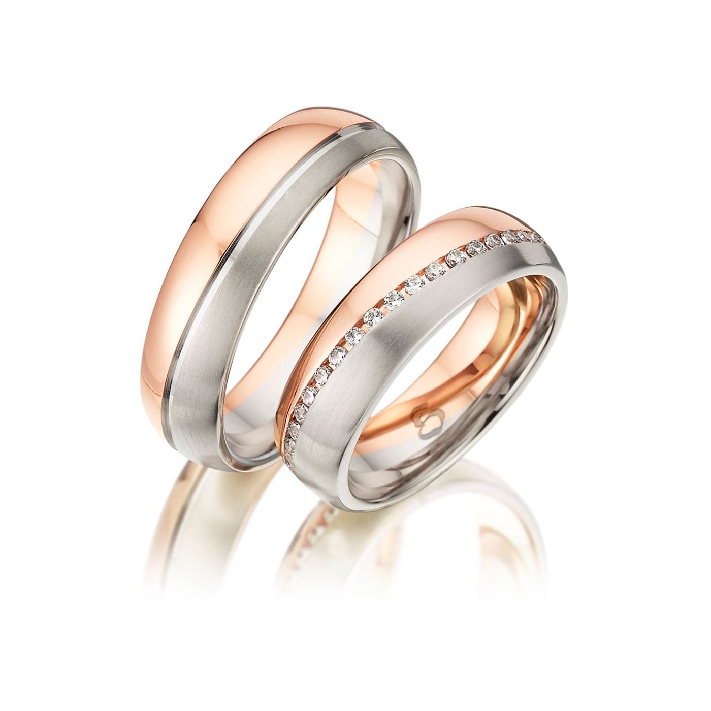 Diese schönen Eheringe aus der Fantasy 2 Kollektion sind 6mm breit mit einer Stärke von 2mm. Sie sind diagonal zweifarbig rot-/weißgold. Der weißgoldene Teil wurde längsmattiert, der rotgoldene Teil poliert. Der Damenring wird zudem mittig durch einen Kanal mit 0,01ct. Diamanten rundherum wunderschön geschmückt. Die Gesamtanzahl der Diamanten ist abhängig von der Ringgröße (In Größe 58 sind es 50 Stück). Es gibt sie in allen Größen von 45 -75 in 0,5 Schritten. Außerdem kann die Goldlegierung 333, 375, 585 und 750 ausgewählt werden. Wir können Ihnen die Ringe ebenfalls in Weiß-, Rot-, Rosé-,Graugold und Platin anbieten, bitte kontaktieren Sie uns hierfür und wir beraten Sie gerne.
