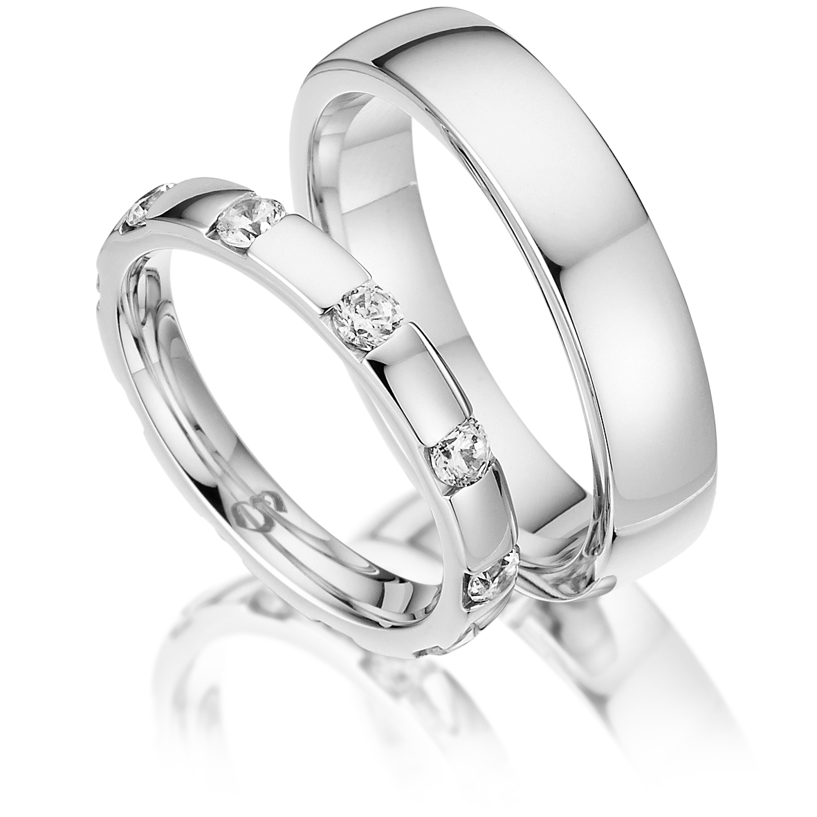 Diese schönen Eheringe aus der Fantasy 2 Kollektion sind unterschiedlich breit. Der Damenring misst eine Breite von 3mm und der Herrenring 5mm. Beide sind relativ hoch mit einer Dicke von 2,2mm. Sie sind bestechen durch ihr schlichtes aber sehr elegantes Design. Die Ringe sind weißgold poliert und der Damenring ist mit 10 Diamanten mit insgesamt 0,8ct. Gesamtkarat bestückt. Es gibt sie in allen Größen von 45 -75 in 0,5 Schritten. Außerdem kann die Goldlegierung 333, 375, 585 und 750 ausgewählt werden. Wir können Ihnen die Ringe ebenfalls in Weiß-, Rot-, Rosé-,Graugold und Platin anbieten, bitte kontaktieren Sie uns hierfür und wir beraten Sie gerne.