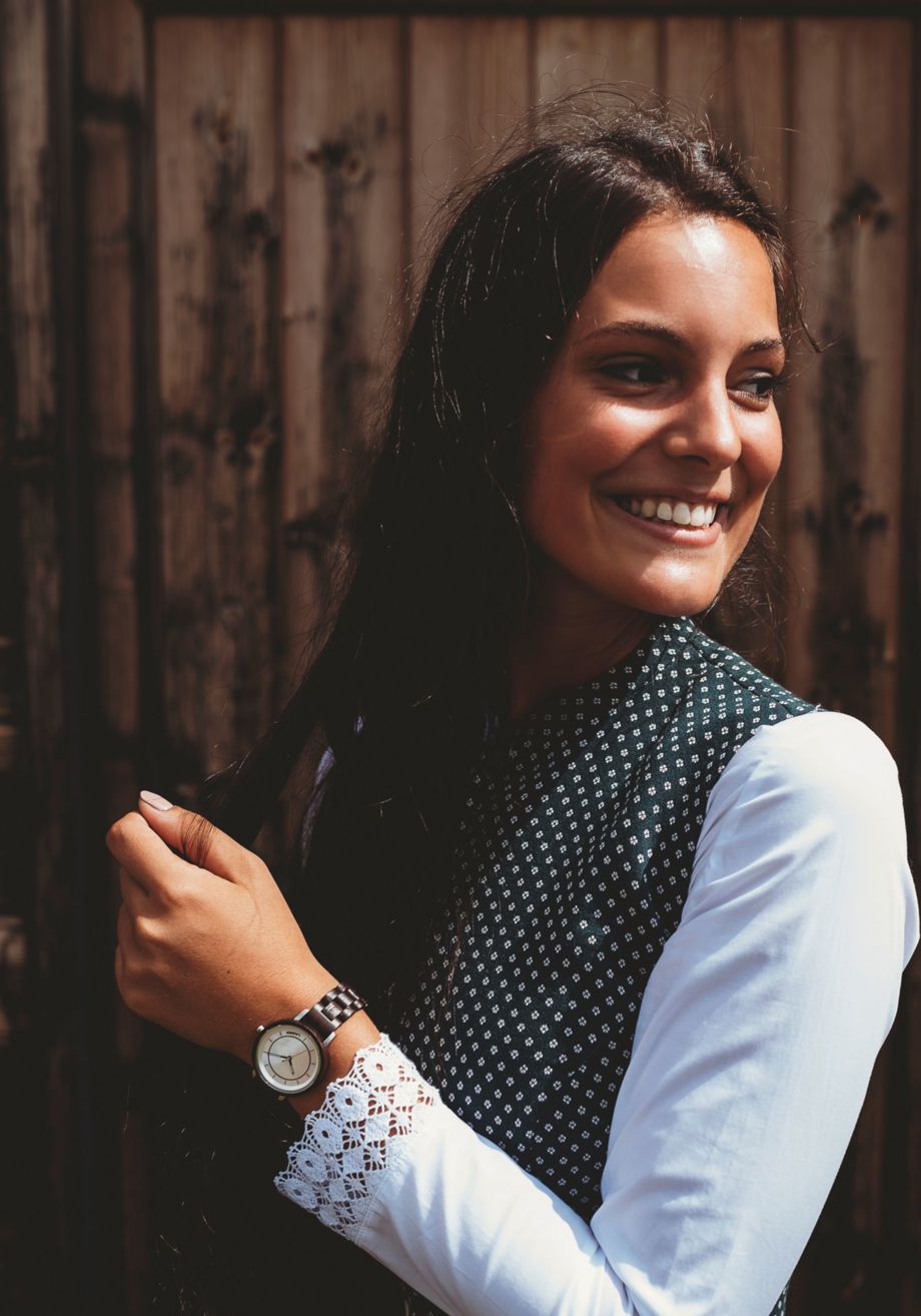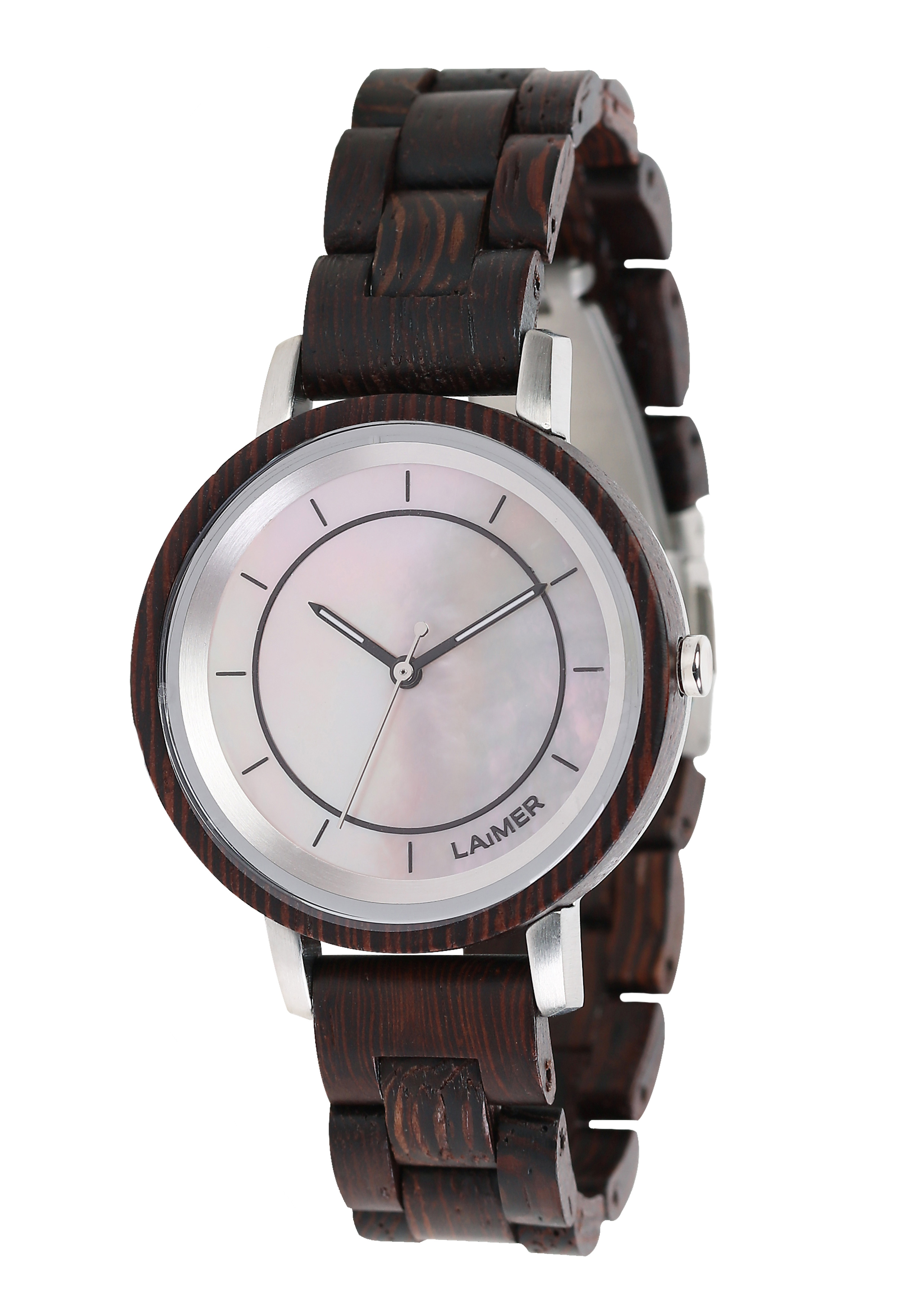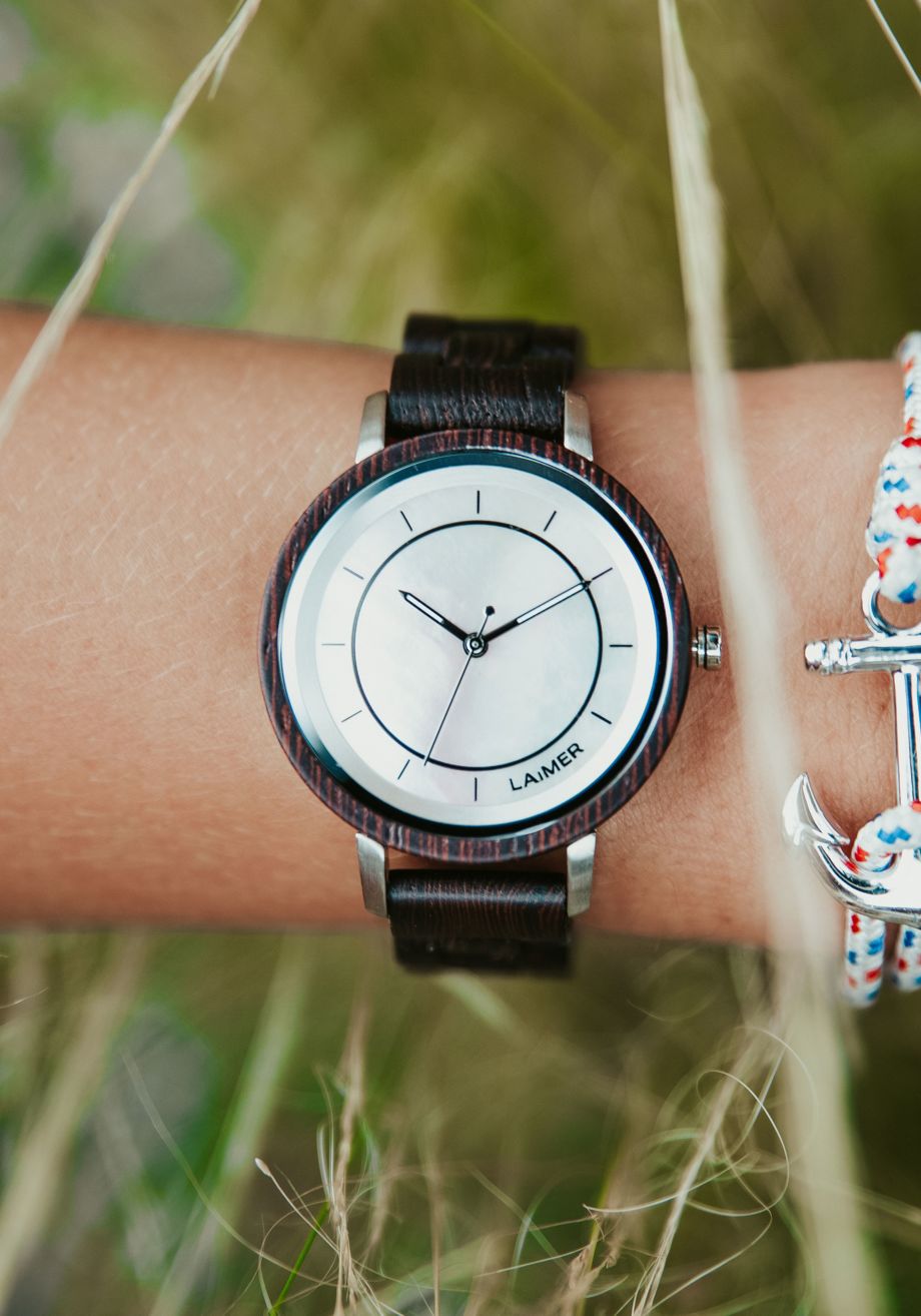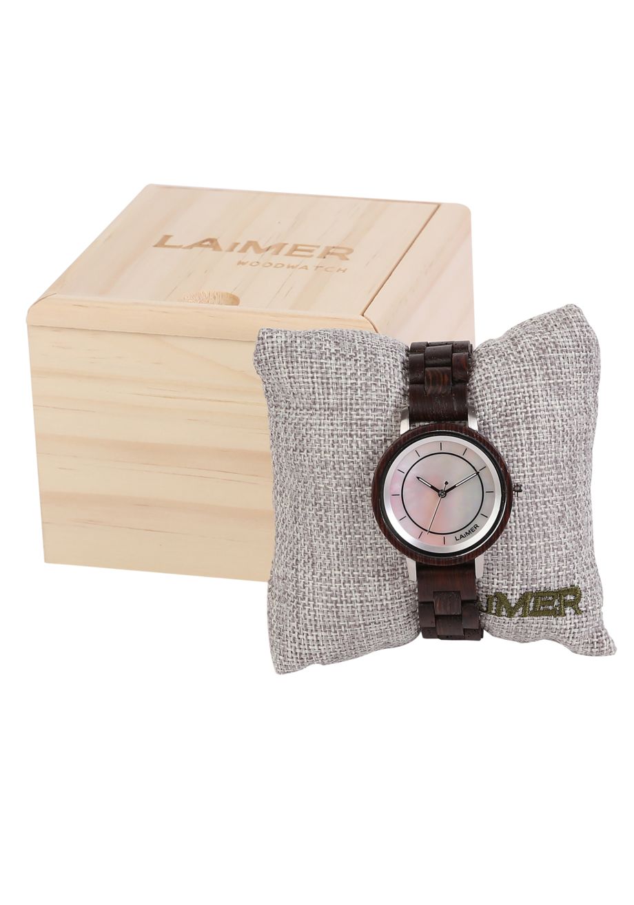 KAROLIN ist mit ihrem rosa-Perlmutt Zifferblatt und dem Wengenholz ist ein richtiger Hingucker und darüberhinaus leicht wie eine Feder.