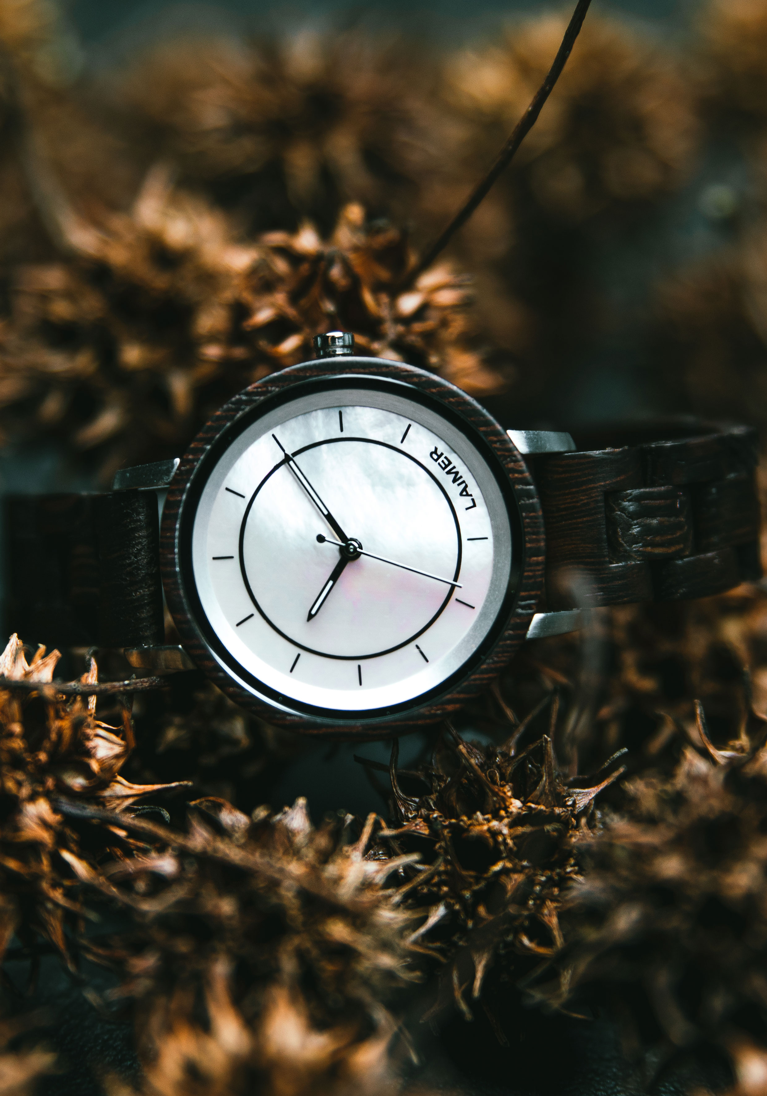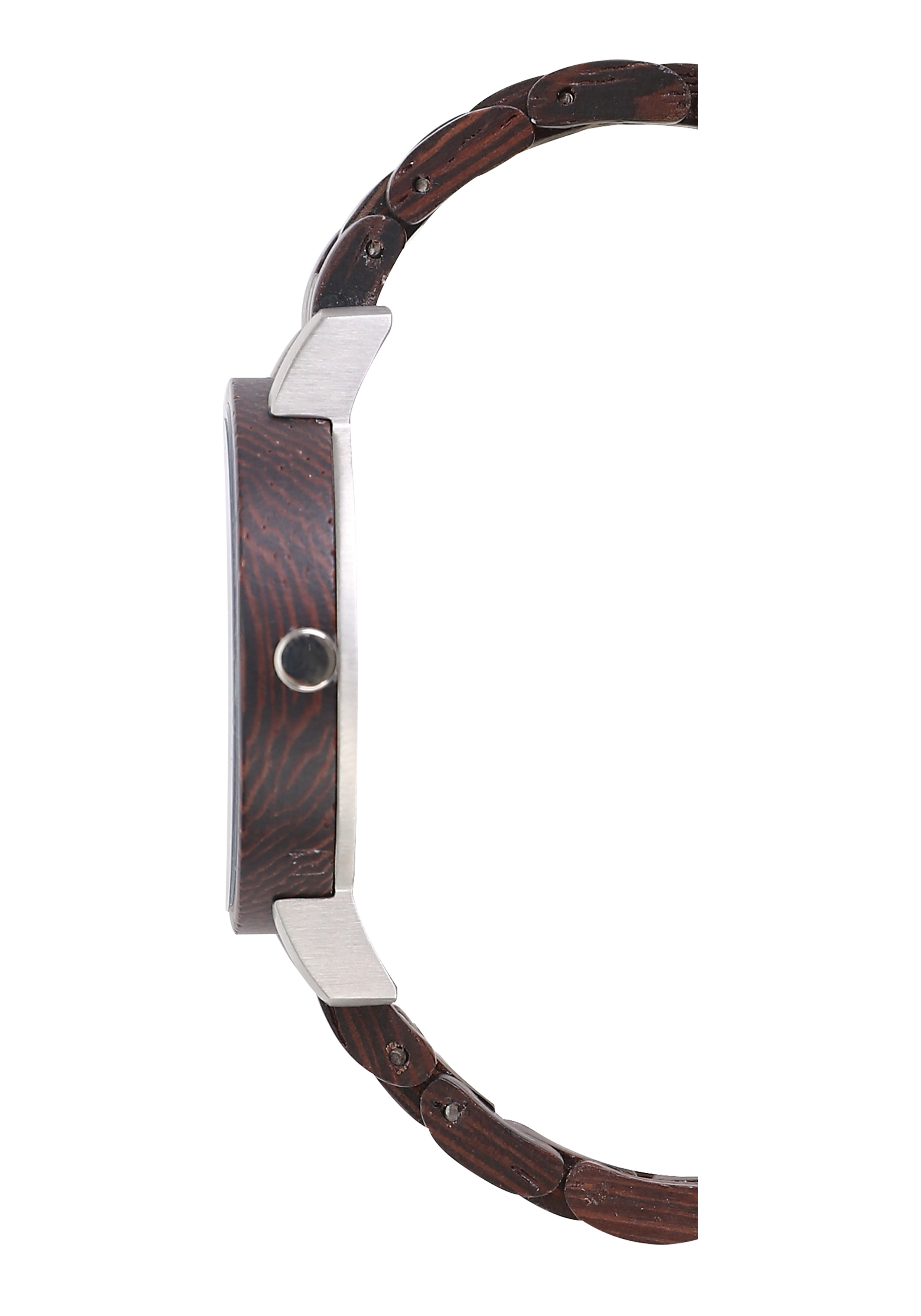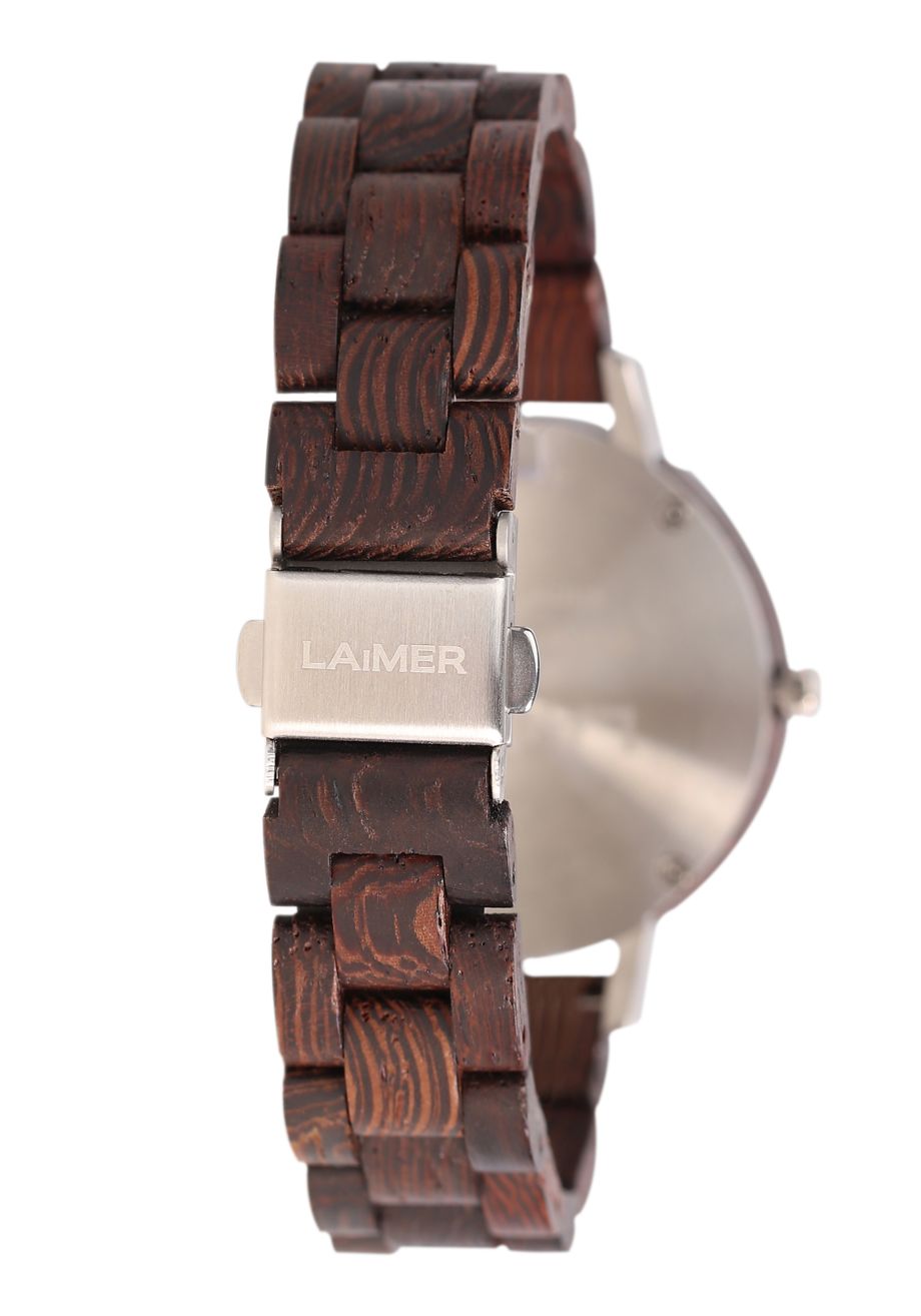 KAROLIN ist mit ihrem rosa-Perlmutt Zifferblatt und dem Wengenholz ist ein richtiger Hingucker und darüberhinaus leicht wie eine Feder.